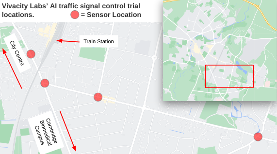 For anyone who has driven, cycled, walked or e-scooted along Hills Road would have seen the Smart Signals project, however the sensors and cameras which underpin its functioning would have, most likely, escaped attention. For, in the words of author Adam Greenfield, “the average pedestrian is at best only liminally aware of the presence or operation of [smart city] sensors. From the sidewalk, they appear as a retrofitted profusion of little-noticed and more or less inexplicable pods on facades and lampposts”. As can be seen with the below image, the mechanics of the project, protruding from the traffic light, somewhat blend into the everyday furniture of the urban realm. The junctions selected can also be seen below and are of note given their proximity to the Biomedical Campus.